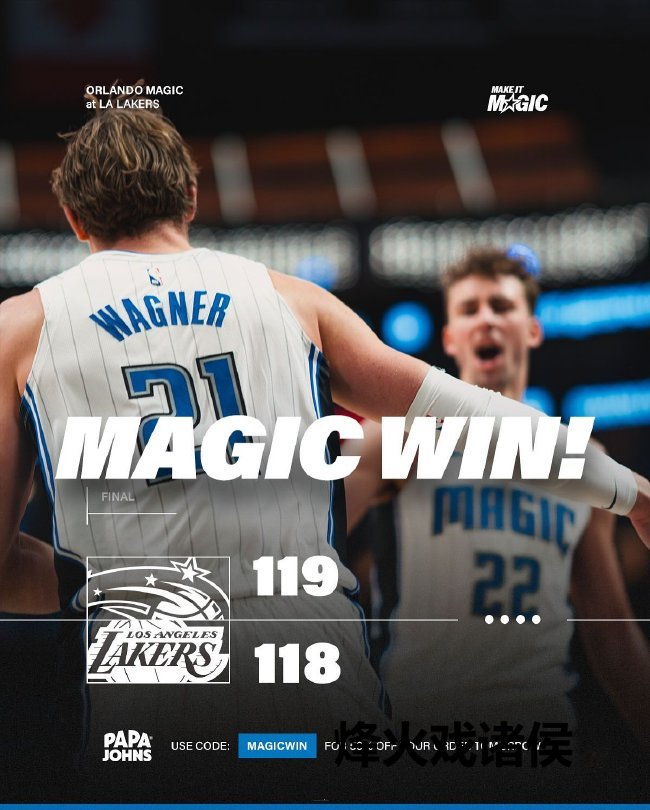 魔术(10-7):小瓦格纳37分6篮板11助攻4抢断、萨格斯23分5篮板5助攻、大瓦格纳19分5篮板4助攻、席尔瓦12分4篮板、加里-哈里斯11分、比塔泽7分15篮板